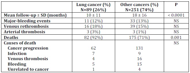 Table 2. Clinical Characteristics of the Venous Thrombotic Events and Outcome Variables in Patients with Lung vs. other Types of Cancer