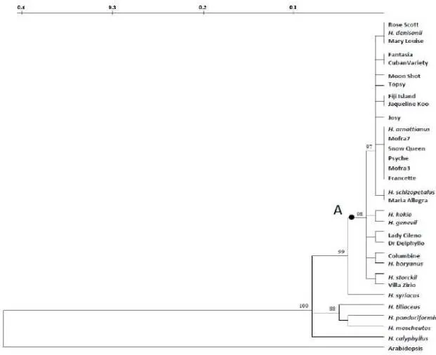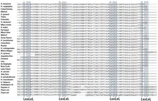 The high conservation sequence degree observed among commercial varieties and the Hibiscus species sexually compatible with H. rosa-sinensis are in agreement with the cytogenetic evidence produced by Singh and Khoshoo (1989), which showed that these inter-fertile species have contributed to the extensive genetic variability of H. rosa-sinensis. The revealed HibMAX2-like sequence analysis is consistent with secondary ranks of taxa (Sections) proposed by Pfeil and Crisp (2005) through chloroplast DNA analysis. In fact, the highest similarity values for the target sequence were achieved among the analyzed H. rosa-sinensis cultivars and the sexually compatible species, all belonging to the Lilibiscus Section, while the lower values were observed for species of different taxonomic Sections such as H. syriacus, H. panduriformis, H. moscheutos, H. tiliaceus and H. calyphyllus. Concerning the H. cannabinus, it could likely either do not possess the HibMAX2 gene, or possess a highly differentiated element, therefore not amplified. Kenaf is one of the fast-growing plants classified in the Furcaria Section of Hibiscus; it has both annual and biennial genotypes, often not branched. This differentiates from the other examined species (shrubs or small trees) characterized by perennial life cycle, with complex vegetative morphologies (Craven et al 2003). Moreover, a previous study (Braglia et al 2010) had revealed the lowest genetic similarity value between H. rosa- sinensis cultivars and kenaf defining this latter as the most distantly related species within the Hibiscus genus.