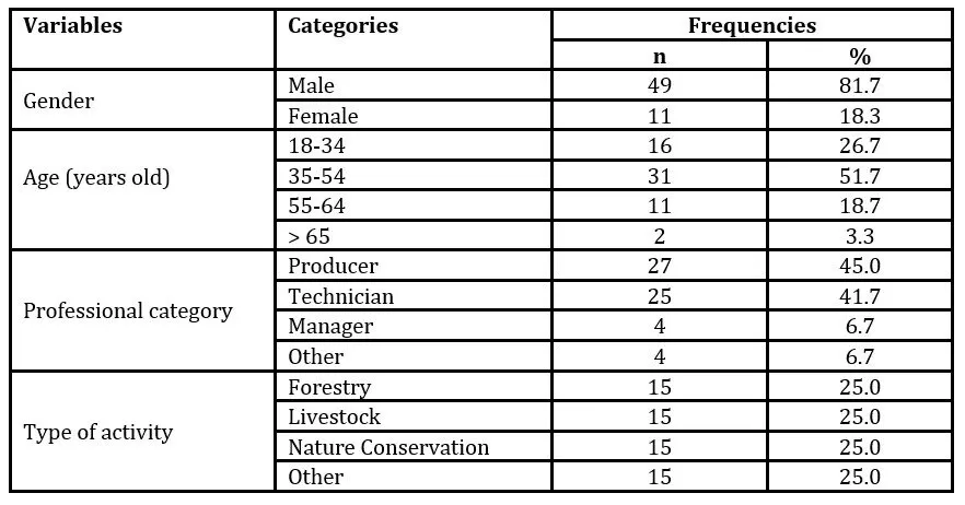 As shown in Table 1, the majority of interviewees were producers (45.0%) or sector technicians (41.7%). In relation to the sector of activity, the interviewees were equally distributed across the sectors, forestry (25.0%), livestock (25.0%), nature conservation (25.0%) and other (25.0%), including the latter, activities such as beekeeping, hunting, professional education and inspection, the first two being the most practiced, with percentages of 46.7% and 26.7%, respectively.