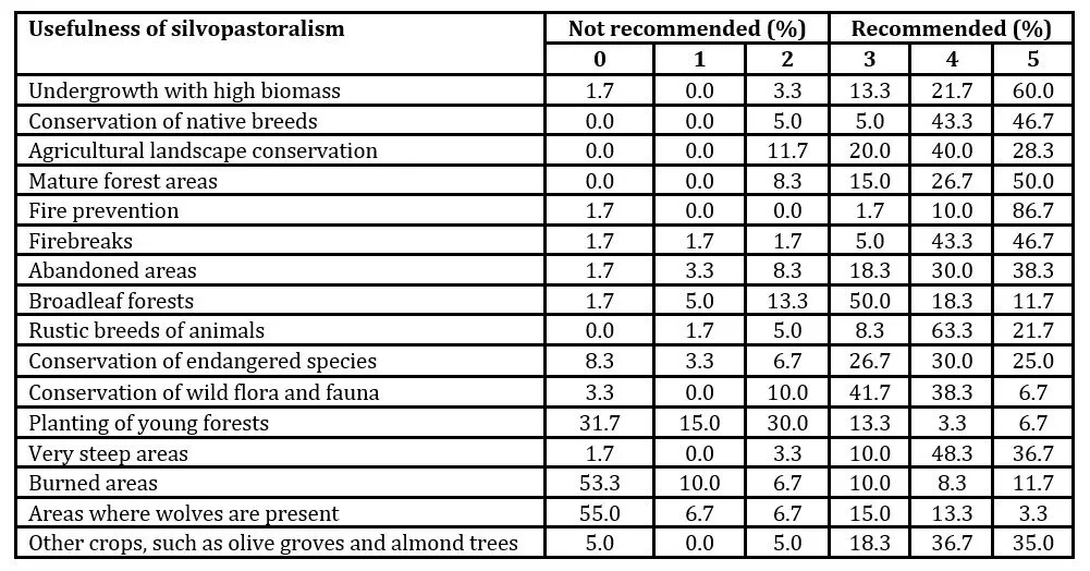 According to the results, the practice of silvopasture is very useful and therefore highly recommended in preventing fires (86.7%), in understory with a lot of biomass (60%), and in areas of mature forest (50%). This practice was also considered recommended, with response percentages equal to or greater than 40%, in the preservation of rustic breeds of animals (63.3%), in very steep areas (48.3%), in the maintenance of native breeds (43.3%), in firebreaks (43.3%) and in the conservation of the agricultural landscape (40%) (Table 2). However, this practice is less recommended in burnt areas (53.3%) and areas where there are wolves (55%).