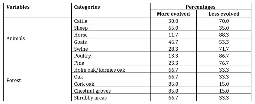 Regarding the type of forest, the interviewees consider that the holm oak, the oak, the cork oak, the chestnut groves, and the shrubby areas are more developed compared to the past (Table 3). For the pine species, 76.7% of those interviewed considered that the practice of silvopastoralism is less developed, being the only forest species that they consider to have weak development.