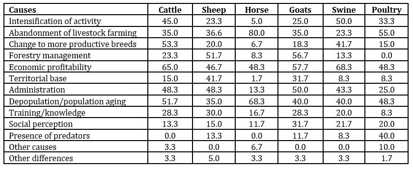 Table 4: Causes for the current silvopastoral scenario for different animal species (%)