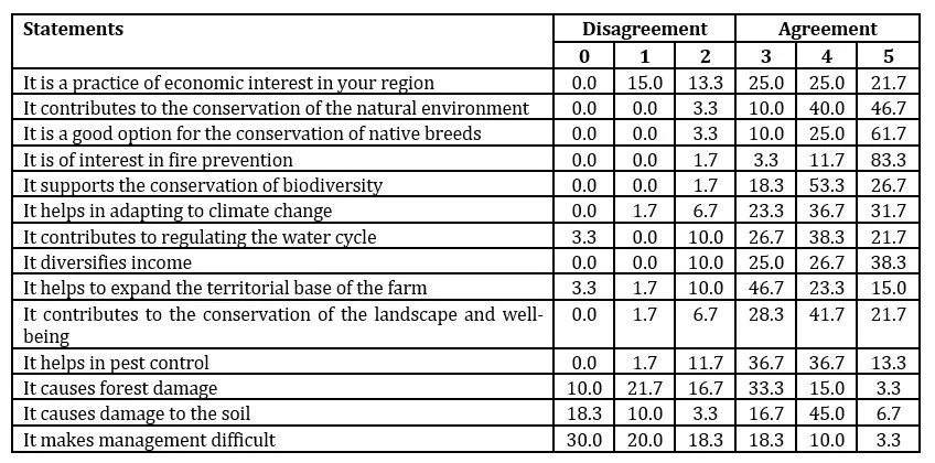 Analyzing Table 5, it can be seen that less than 25.0% of those interviewed strongly agree that silvopasture is a practice of economic interest in the region. However, the majority agree or strongly agree that silvopastoralism contributes to the conservation of the natural environment, is a good choice for the conservation of native breeds, is of great interest for fire prevention, and supports biodiversity.