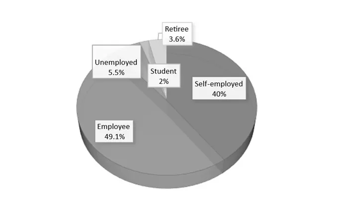 Considering the profile of the family head, Table 1 indicates that most family heads resided in urban areas (54.5%), were female (58.2%), relatively young (49.1%), married or in a marital union (70.9%), and had completed at least lower secondary education (65.5%). Ages of family heads ranged from 20 to 75 years, with a mean of 42.3 years (SD = 13.73). The median and mode were 43 and 21 years, respectively. Additionally, most households reported an income between 5,800 and 11,400 metical (63.6%), equivalent to 2 to 3 minimum wages in Mozambique. Most family heads were either self-employed (49.1%) or employed by others (40.0%), as shown in Figure 1.