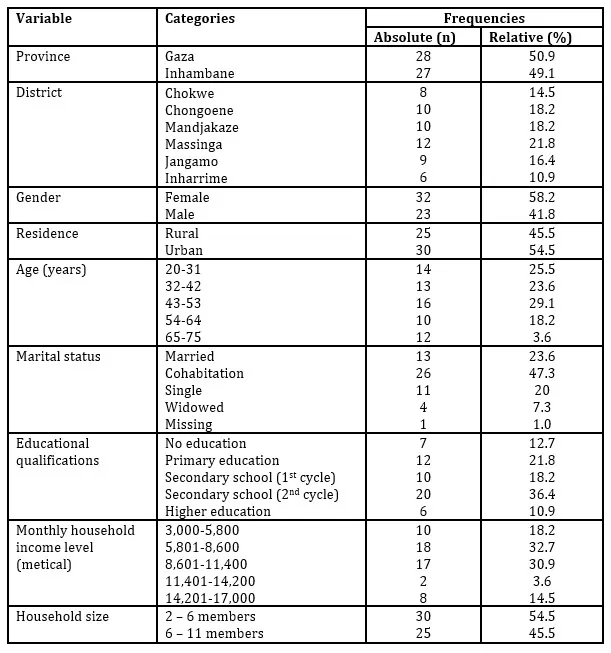 The heads of 55 households were interviewed, 28 from Gaza Province (50.9%) and 27 from Inhambane Province (49.1%), as shown in Table 1. Most households consisted of 2 to 5 members (54.5%), while the remaining households had between 6 and 11 members (45.5%).