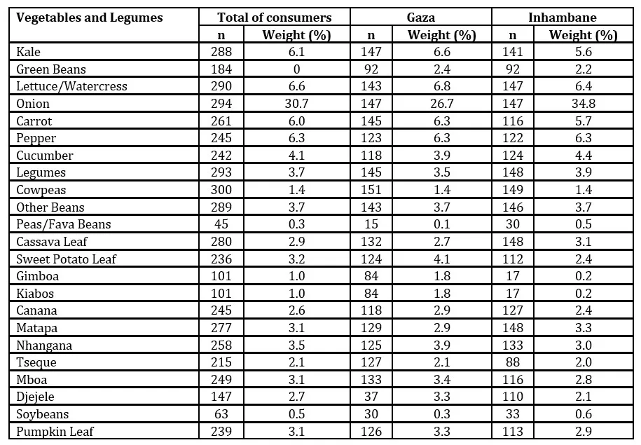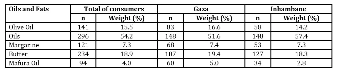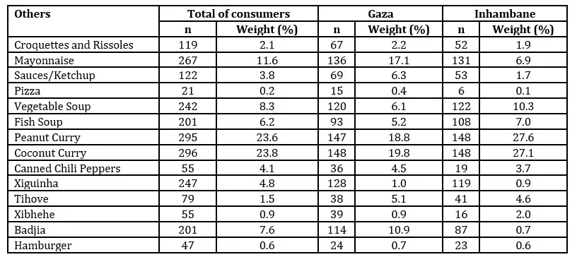 (Table 10). In Inhambane, the average consumption of coconut and peanut curry was higher than in Gaza. In Inhambane, vegetable soup ranked third among the highest-weighted products, while in Gaza it was mayonnaise.
