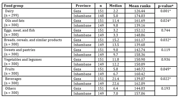 The comparison of consumption by province shows no statistically significant differences for “Eggs, meats and fish” (p-value = 0.744 > 0.05), “Sweets and pastries” (p-value = 0.119 > 0.05), “Vegetables and legumes” (p-value = 0.936 > 0.05), and “Others” (p-value = 0.193 > 0.05), indicating that monthly quantities were similar across provinces. However, Gaza showed higher consumption of “Oils and fats” and “Bread, cereals and similar products” (p-value < 0.05). In contrast, Inhambane showed higher consumption of “Dairy” (p-value = 0.001 < 0.05), “Fruits” (p-value = 0.049 < 0.05), and “Beverages” (p-value = 0.022 < 0.05), as shown in Table 11.