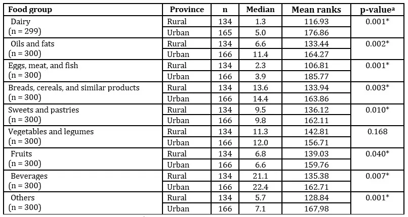 The comparative analysis of median monthly consumption revealed that the intake of eggs, meat, and fish, sweets and pastries, and other foods was largely consistent across both provinces. However, differences emerged across all food groups when considering the type of residence, most prominently in the vegetables and greens category. Demographic factors, including age and gender, influenced consumption patterns primarily in the dairy and beverages groups.