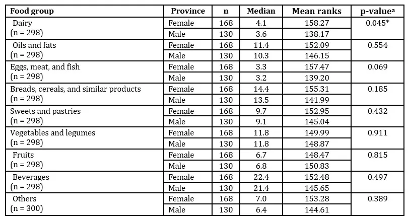 Only “Dairy” consumption differed significantly by gender, with females consuming more than males (p = 0.045 < 0.05). For other groups, consumption was similar across genders (p-value > 0.05) (Table 13).