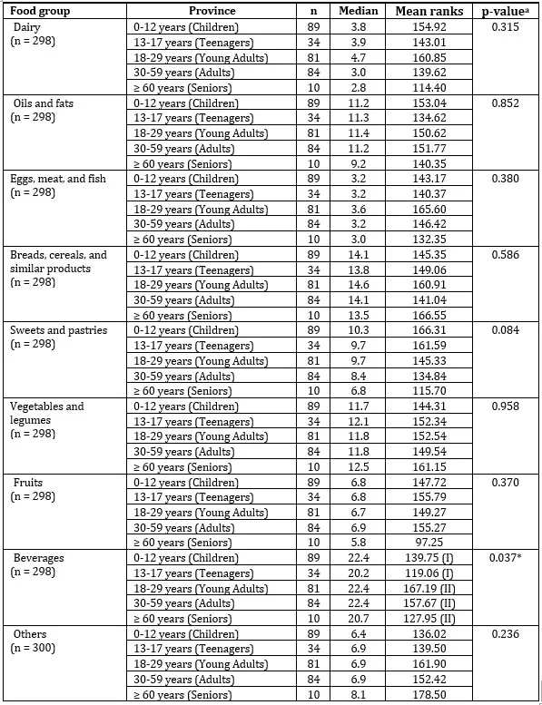 Regarding age groups, the “Beverages” food group was the only one to show statistically significant differences (p-value = 0.037 < 0.05). For the remaining food groups, although differences were not statistically significant (p-value > 0.05), some disparities were observed. For instance, elderly individuals consumed the least amounts of “Dairy,” “Eggs, Meats and Fish,” “Sweets and Pastries,” and “Fruits.” This age group, however, had the highest consumption of “Vegetables and Legumes,” “Bread, Cereals and Similar,” and “Other” food items. In contrast, children consumed higher amounts of “Oils and Fats” and “Sweets and Pastries,” and lower quantities of “Vegetables and Legumes” and “Other” foods. Young adults consumed the most “Dairy” and, together with adults, were the highest consumers of “Eggs, Meats, and Fish.” Additionally, adults consumed lower quantities of “Bread, Cereals and Similar” but higher amounts of “Fruits,” along with adolescents. Adolescents, in turn, consumed the lowest amounts of “Oils and Fats” (Table 14).