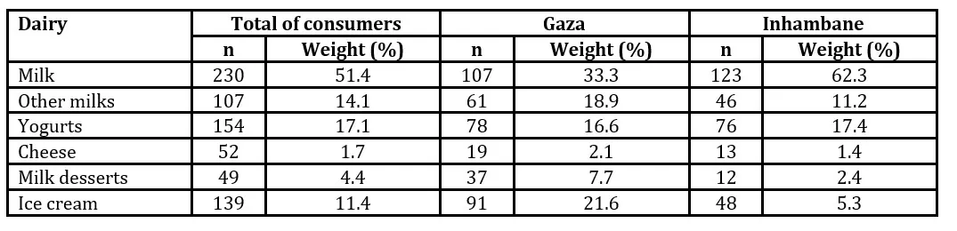 Within the “Dairy” group, Table 2 shows that the three foods with the highest weight were milk (51.4%), yoghurt (17.1%), and other dairy products (14.1%), with milk and yoghurt having a higher weight in Inhambane compared to Gaza.