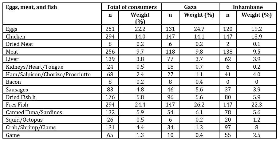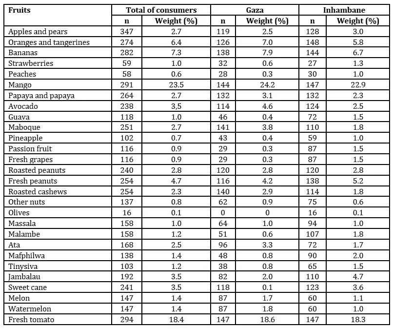 Against this backdrop, the present study aimed to describe the dietary habits of populations in Gaza and Inhambane provinces and to assess potential differences in monthly consumption by province, residence, sex, and age group.