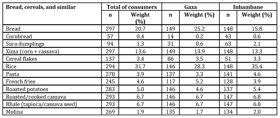 In the food group “Bread, cereals and similar”, rice (31.7%), bread (20.7%), and xima (13.6%) are foods that account for more than 10% (Table 5) and are also the products sought by the largest number of consumers.