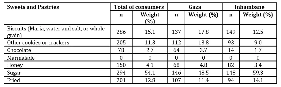 Within the “Sweets and Pastries” group, the three products with the highest consumption weight were sugar (54.1%), biscuits (Maria, water & salt, or wholemeal) (15.1%), and fried cakes (12.8%) (Table 6). In Inhambane, biscuits were consumed by all family members, while fried cakes (14.1%) had a higher weight compared to Gaza (11.4%).