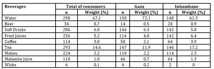 Within the “Beverages” group, water (67.1%), tea (14.6%), and soft drinks (6.0%) were the three products with the highest weight in the diet, as well as the most frequently consumed (Table 8). However, by province, consumers in Inhambane preferred fruit juices, whereas those in Gaza preferred soft drinks.