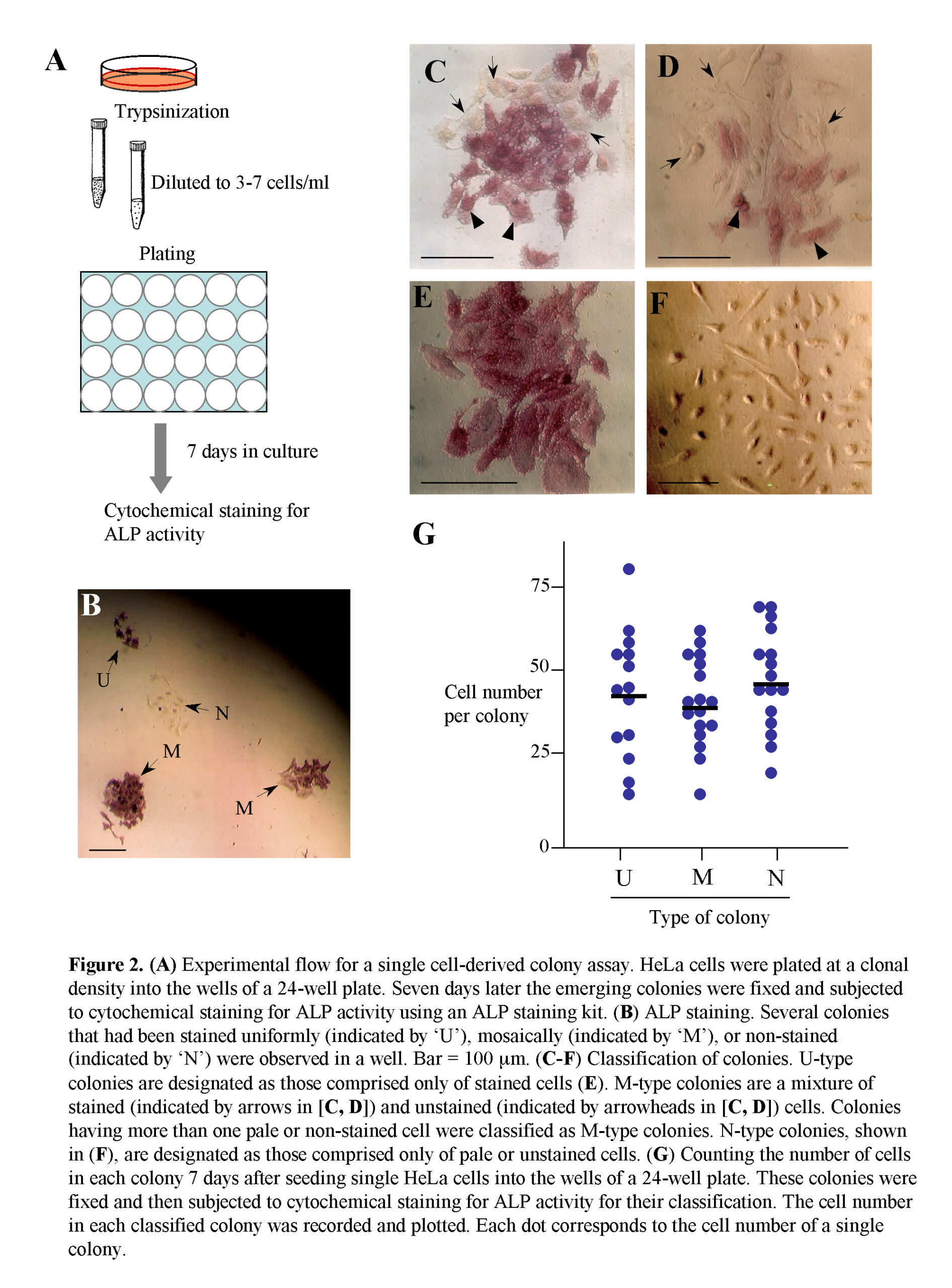 The proliferation rates of U-, M-, and N-type colonies were assessed by counting cells in a colony generated 7 days after plating single HeLa cells onto a 24-well plate. There was no noticeable difference between the colony types in cell number per colony (Fig. 2G).