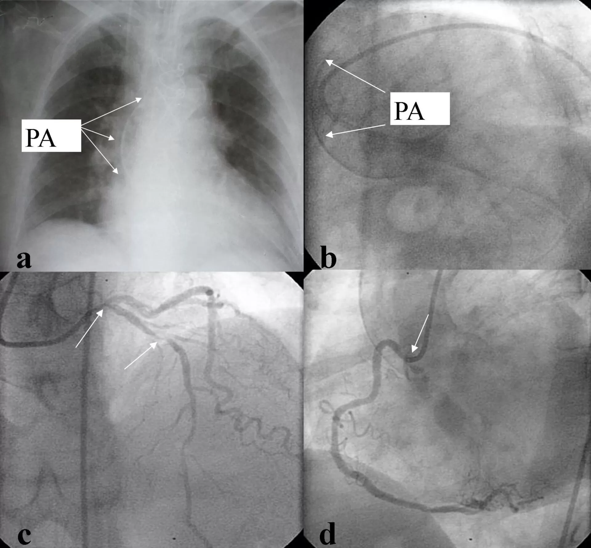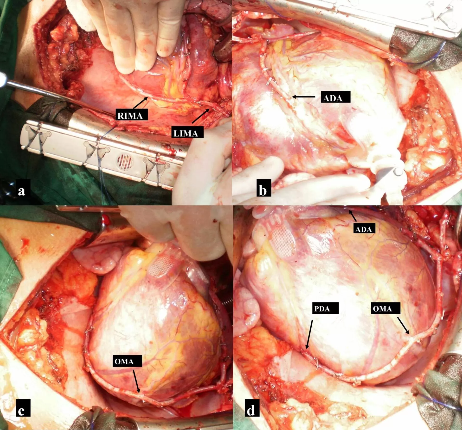 First, we grafted the pedicled LITA to the LAD with an end-to-side anastomosis (Fig. 2 b). Then obtuse marginal branch (OM), and PDA of RCA were anastomosed sequentially with RITA side-to-side and end-to-side respectively (Fig. 2 c y d). All anastomoses were performed with 8-0 Prolenesuture. Rest of the surgical procedure was completed in the usual fashion without complications. Duration of extracorporeal circulation was 83 minutes. Postoperative course and convalescence progressed uneventfully. After ten days of in hospital postoperative care the patient was discharged with evident clinical and hemodynamic recovery. Eighteen months after hospital discharged he was asymptomatic (New York Heart Association Class I, Canadian Cardiovascular Society Class I). Transthoracic echocardiography showed normal function and size of both ventricles. Postoperative multi-slice computed tomographic angiography showed patency of every graft.