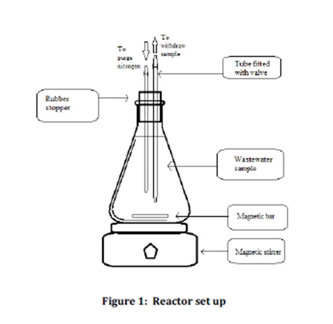 Nine reactors with a working volume of 1 L were set up in this study as shown in Figure 1. A rubber stopper fitted with two tubes was used to seal the reactor. A stop valve was attached to each tube. The first tube was used to purge nitrogen gas into the reactor while the second tube was used to extract the wastewater sample from the reactor. This study was conducted under anaerobic condition. This was ensured by purging nitrogen gases for 10 minutes into each set of samples during the set up. Each reactor set up was equipped with magnetic bar and placed on the magnetic stirrer to ensure complete mixing.