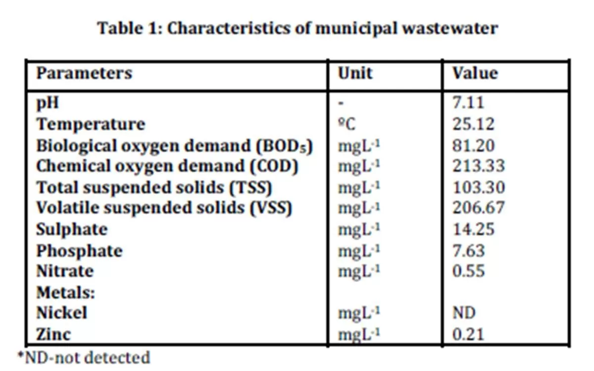 The characteristics of municipal wastewater were evaluated by analyzing several parameters listed in Table 1.