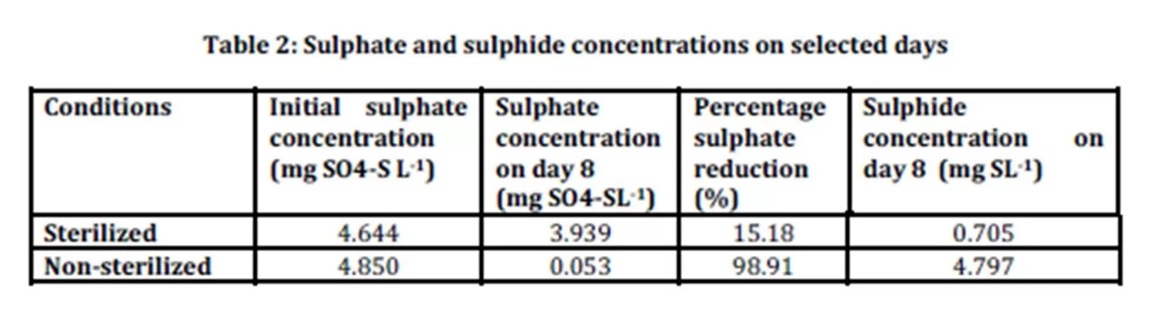 Sulphate concentrations were measured in all samples at day 1 and day 8. Table 2 shows the averages of initial sulphate concentration in sterilized (control) and non sterilized samples to be 4.644 mg SO4-SL-1 4.850 mg SO4-SL-1 respectively.