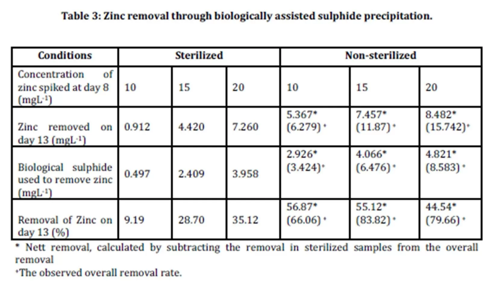 The calculation for the percentage removal of zinc for non sterilized samples was calculated taking into account the results of the control experiments. The net percentage removal of non sterilized samples was calculated by deducting the removal observed in control experiments from the overall percentage removal. Net zinc removals in non-sterilized samples were found to be in the range of 44.54-56.87%. The highest percentage removal of zinc (56.87%) was achieved in the non sterilized samples spiked with 10 mgL-1 of zinc. In the non sterilized samples spiked 15 mgL-1, 55.12% of zinc was removed, while 44.54% of zinc was removed from the non sterilized sample spiked with 20 mgL-1 zinc. The net zinc removal in non sterilized samples was attributed to the precipitation of insoluble zinc sulphide as a result of the biological sulphide produced by the biological activities of sulphate reducing bacteria.