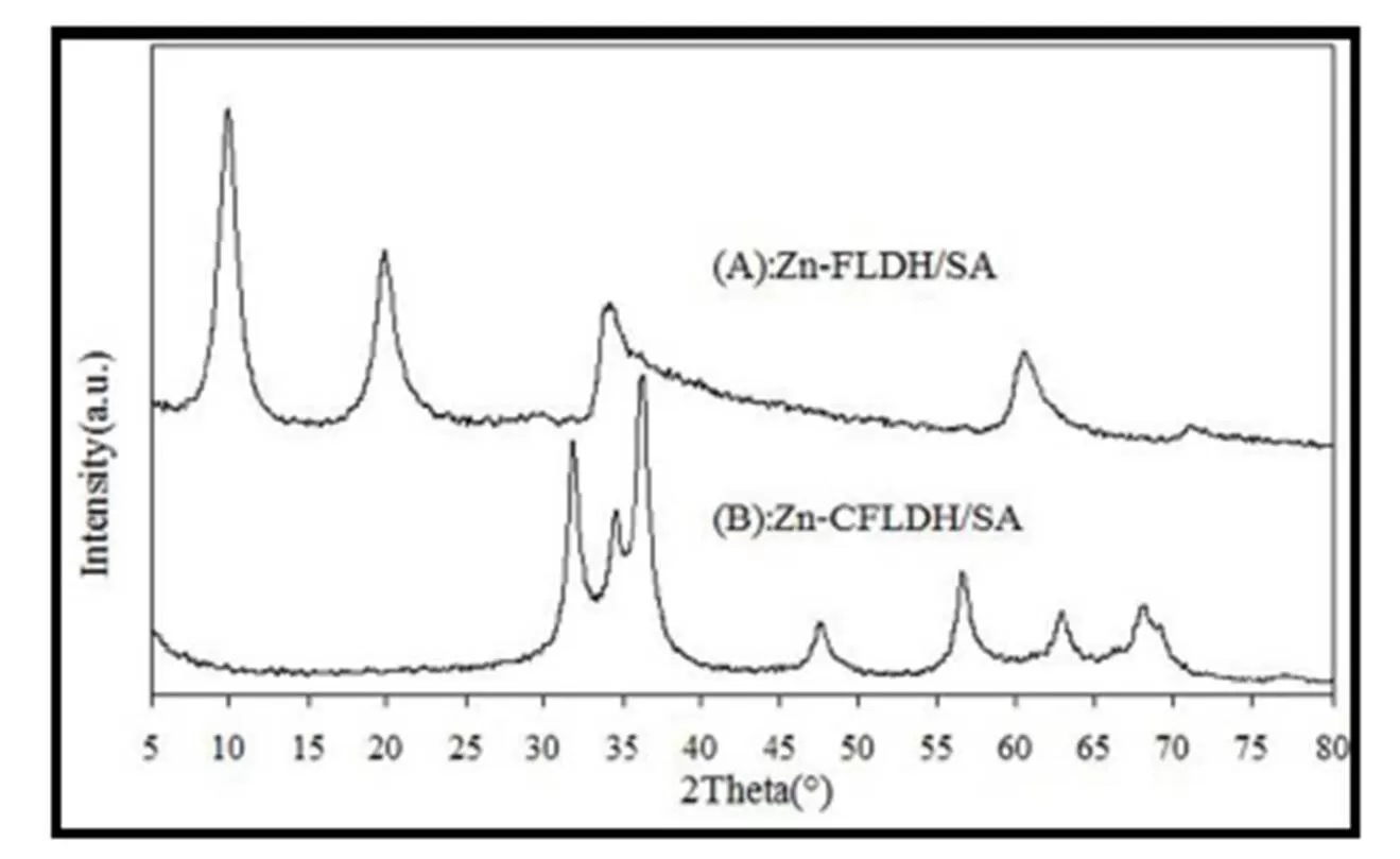 Fig.1 illustrates the powder X-ray diffraction (XRD) patterns of Zn-FLDH/SA and Zn-CFLDH/SA. A gives several typical reflections at 2θ=10.2, 20.0, 34.4, 61.1, which Rives (2003) mentioned in his paper and confirmed that no significant structural variations occurred after SA intercalated as compared to the original typical reflections, and also shows that it is highly crystalline material. B gives some typical reflections at 2θ=32.1, 36.2, 47.1, 57.3, 63.2, 66.5, which are almost identical to the typical pattern characteristic of ZnO as Shi (2013) reported , while the package peaks between 34.22 ~ 37.5 due to the amorphous peak of Al2O3 as Constantino (1994) mentioned. It can be concluded that the Zn-CFLDH/SA is mostly in the form of metal oxide.