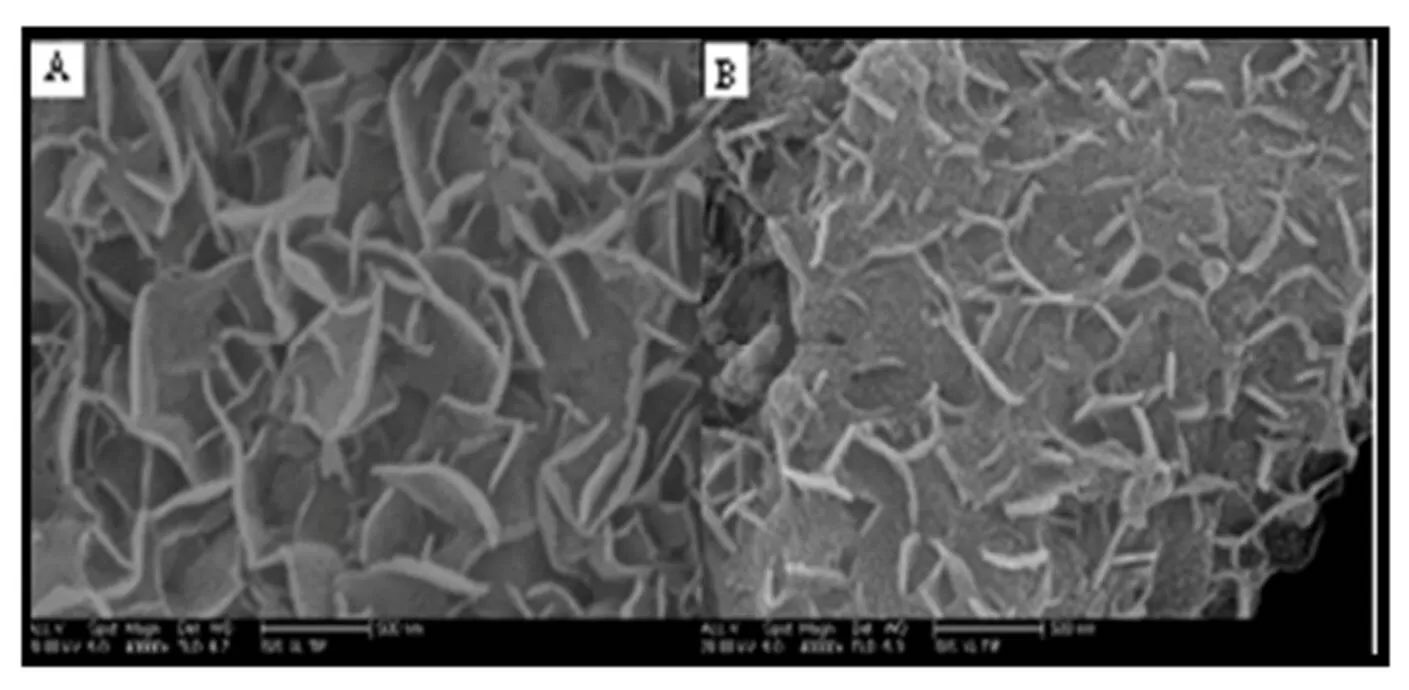 Fig.3 A and B illustrates the SEM images of Zn-FLDH/SA and Zn-CFLDH/SA, respectively. The A image shows that the sheet particles of Zn-FLDH/SA form petal-like structures with many cavities, and this leads to the hierarchical structure stacking of LDHs nanoflakes according Zhi’s report (2010) . This compound consists of interleaved flexible curled nanosheets that are 10—20 nm thick and 200—500 nm long. This is possibly because in the intercalation reaction of SA, its large ion results in the expansion of LDHs, and the interlayer spacing increases gradually along with the insertion of SA. When the interlayer spacing becomes large enough such that the interaction force between the layers completely disappears, the LDHs appears as monolayer, which then self-assembles into the Zn-FLDH diaphragm in the saturated solution of SA and forms Zn-FLDH/SA nanoflakes. Zn-CFLDH/SA is maintaining the original morphology, apparently, which has flake-like crystals stacked over one another to form layers. But during the calcinations, the water in the laminate and the anion SA- intercalation peeled out from the Zn-CFLDH/SA structure, these lead to more cavities.