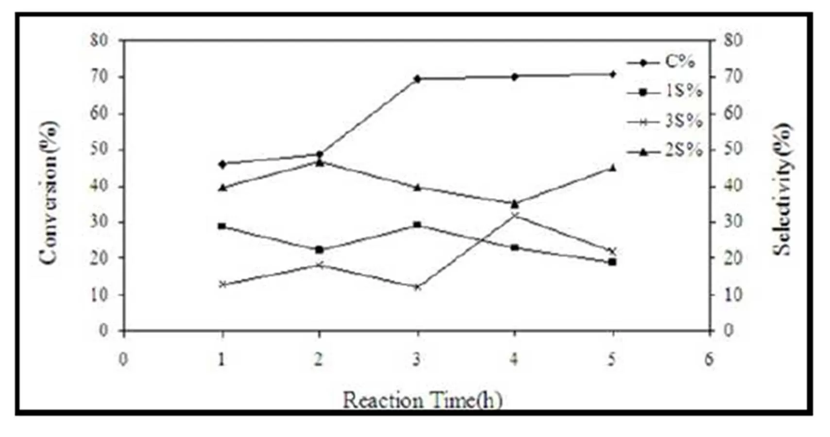The effect of reaction time on the α-pinene oxidation reaction catalyzed by Zn-CFLDH/SA was investigated. The results are shown in Fig.4, which reveals that the α-pinene conversion increases drastically with an increasing reaction time at the beginning and then levels off at 70% after 3 hours, because of the reaction fulfillment. However, the selectivities of the three products show major change and this maybe depends on the specific formed cation evolving after protonation of the a-pinene molecule at the beginning of the reaction.