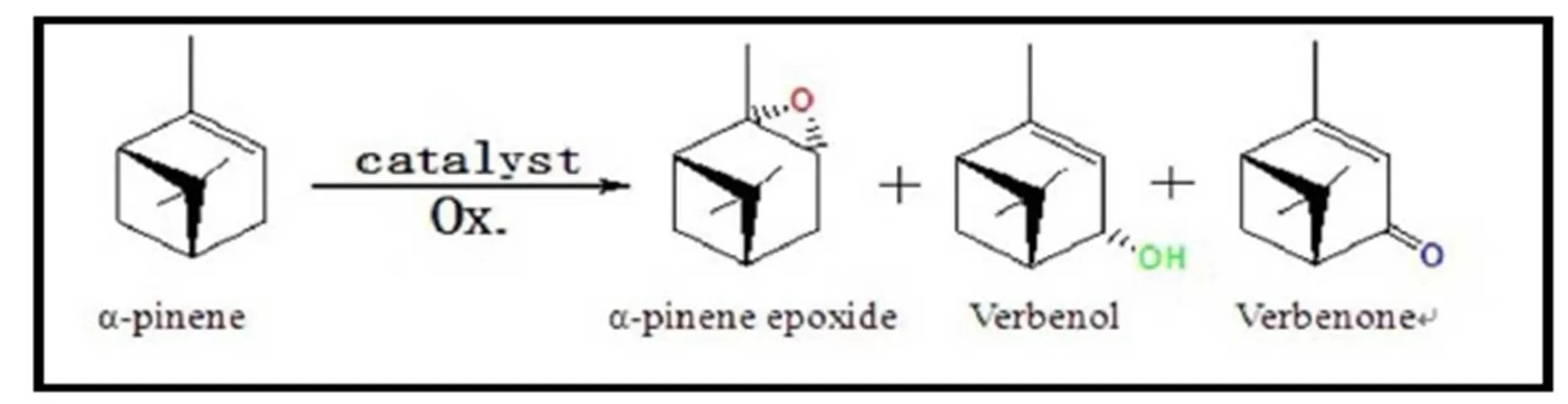 The innovation of catalytic materials as powerful tools for the transformation of chemical raw materials in the forest is greatly significant in the production and application of forestry chemicals. As the main component of turpentine oil, α-pinene not only is a kind of renewable starting material for producing a wide variety of valuable products, but also a readily available and inexpensive of natural resources. Specifically, its oxidation products (see Scheme 1) such as verbenol, verbenone and α-pinene epoxide are of high practical importance as flavor chemicals and key intermediates for the manufacture of various fine chemicals, as Maksimchuk et al (2005) mentioned, including medicine intermediates, spice additives, fragrances, and agrochemicals, citral, menthol, taxol etc.
