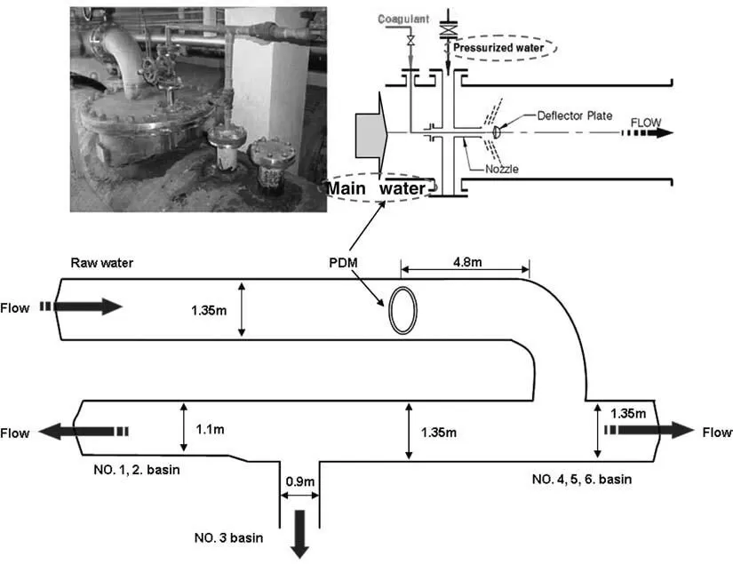 (1) From the wet test for OS WTP, it could be thought that the asymmetric pipe structure in the front and rear of PDM may make the injected coagulant dispersion uneven. In order to solve this problem, it is necessary to secure some distance from the deflector to prevent the interference caused from the asymmetric bend and connection. As shown in Fig. 4, installing a bend and “T” connection at a distance of 4.5 m from the PDM can make the main flow deflected, and ultimately the injected coagulant dispersion uneven.