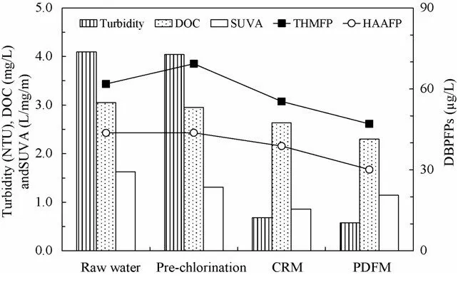 The DBPFPs decreased with reductions in the precursors during water treatment. The trihalomethanes formation potential (THMFP) and haloacetic acids formation potential (HAAFP) in the pre-chlorinated water are 69.3 and 43.8 μg L-1, respectively, which decreased to 47.1 and 30.1 μg L-1, and 55.4 and 38.8 μg L-1 through PDM and CRM, respectively. However, some increase in the THMFP is observed after the pre-chlorination process. This increase could be explained as being due to the formation of intermediate species (e.g., formation of phenolic compounds from the oxidation of aromatic compounds or methyl ketones from the oxidation of olefins) by a partial oxidation process. Since the intermediate species remaining in the solution also react easily with chlorine in haloform reactions (i.e. electrophilic substitution reaction), the DBPFPs of pre-chlorinated water were higher than those in raw water (Kim and Lee (2006)).