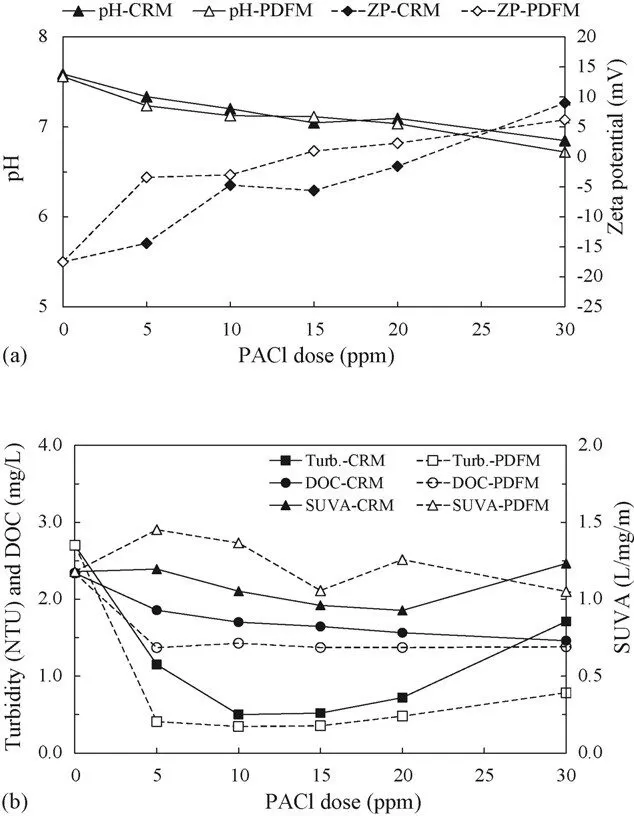 Al salts (Yu et al. (2009)) dissociate when added to water and the Al3+ ions undergo metal ion hydrolysis reactions, and the nature of the resulting species depend on such variables as Al concentration, pH, temperature and the presence of other ions. In general, the destabilisation mechanisms (Gregory (2006)) by monomer and polymeric species of Al are different from each other. That is, charge neutralisation (Barany and Szepesszentgyörgyi (2004)) is mainly influenced by the monomer species prior to the completion of the Al hydrolysis reaction, while sweep coagulation and/or adsorption depend more on the polymeric species. Therefore, the rapid and uniform dispersion of the coagulant could influence the charge neutralisation mechanism, the possibility of which has been identified in the literature. Amirtharajah (1981) suggested that the smaller eddies formed at higher G values might be more successful in transporting preformed Al hydrolysis species to the surface of the particles responsible for turbidity, and that the rapid-mix G value is important in charge neutralisation. This is also indirectly identified by the determination of the zeta potential, as shown in Fig. 13(a). In the case of PDM, the zeta potential is more quickly raised than with CRM when the coagulant is under-dosed with respect to optimum conditions for turbidity removal. This indicates that cationic aluminium hydrolysis products immediately neutralised the anionic sites on colloidal NOM and particles early during the Al hydrolysis reaction. Consequently, the coagulation mechanism in the case of CRM is dominated by conventional entrapment (i.e., sweepcoagulation), while PDM is more influenced by charge neutralisation due to the quick dispersion of Al salts prior to the formation of the Al hydroxide precipitate. Also, because of the different reactivities of NOM fractions toward cationic aluminium hydrolysis products, the HLF, which may have a higher charge density and electrostatic attraction than the HBF, is more effectively removed via charge neutralisation. These results are consistent with the greater removal of DOC, whereas the SUVA decreased less by PDFM than with CRM, as shown in Fig. 11 (Kim and Lee (2006)).
