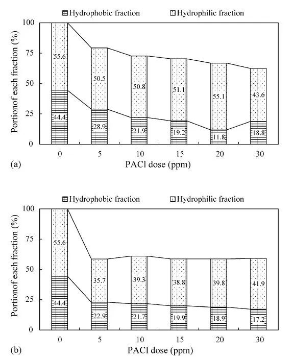 In coagulating and settling the pre-chlorinated water, the variation in treated water quality depending on the coagulant dosage (0—30 ppm) is shown in Fig. 13. Through PDM and CRM, the DOC (2.34 mg C L-1) of the pre-chlorinated water decreased to the ranges 1.43—1.37 and 1.86—1.46 mg C L-1, respectively, with increasing coagulant dosage. The SUVA (1.18 L/mg/m) varied within the ranges 1.45—1.05 and 1.23—0.93 L/mg/m through PDM and CRM, respectively. In the case of PDM, the turbidity and DOC removals were higher than those with CRM, while the SUVA in the treated water was higher than that with CRM, as shown in Fig. 13(b). As shown from the results in Fig. 11, the HLF is more effectively removed by PDFM than CRM. From the isolation of NOM from raw and treated waters, the distribution of the hydrophobic and hydrophilic fractions in the bulk NOM is identified as being influenced by the initial mixing type (Nason and Lawler (2009)), as shown in Fig. 14. In the case of PDFM, the HLF decreased no further even with increases of the coagulant dosage from 5 to 30 ppm (1.2—7.1 mg L-1 as Al2O3). This result could possibly be explained due to the difference between the hydrophilic acids and non-acid HLF in the reactions with the cationic aluminium hydrolysis products. In general, hydrophilic NOM consists of hydrophilic acids and the non-acid HLF (Chang et al. (2001), Parsons et al. (2004)). The hydrophilic acids have higher acidic functional group contents, while the non-acid HLF contains few acidic functional groups. Therefore, it is possible to presume the removal characteristics of the hydrophilic NOM as follows: hydrophilic acids that included sufficient anionic binding sites could be removed via charge neutralisation with cationic aluminium hydrolysis products early during the chemical dispersion, while the non-acid HLF could not be effectively removed, even with increases in the coagulant dosage. The HBF gradually decreased with increasing the coagulant dosage, independent of mixing type, indicating that residual coagulants (which did not participate in the charge neutralisation during aluminium hydrolysis reaction) are changed into insoluble Al hydroxide, with the HBF removed bysweep coagulation and/or adsorption via interactions with the insoluble Al hydroxide (Kim and Lee (2006)).