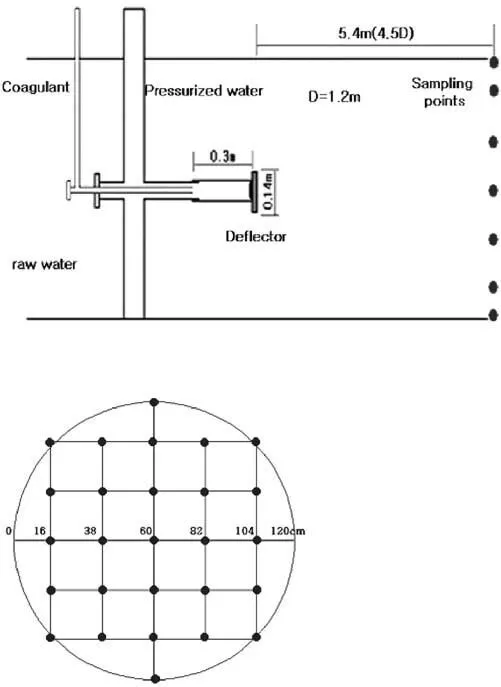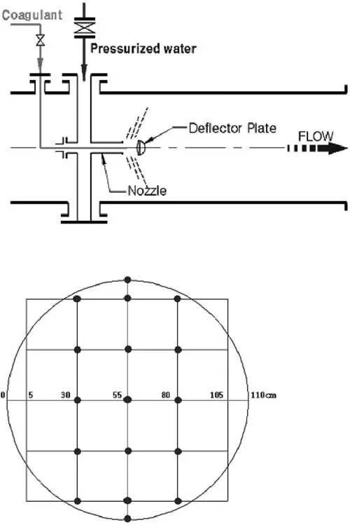 For evaluating the mixing performance of PDM and the coagulant dispersion in it, they conducted the wet test (Park et al. (2009)). The wet tests are used to measure the zeta-potential all over the cross section at a distance of 4.5 D (D = 1,200 mm, D: diameter) from the deflector in the selected PDMs at various pumping rates. The coagulant being used in both of WTPs is PAHCS (Al+, 10.5%). As shown in Figs. 2 and 3, sampling cross section is determined at a distance of 5.4 m (4.5 D) from the deflector, and samples are taken from 14 points in the case of OS WTP and 22 points in the case of SJ WTP, respectively. In both cases, the wet tests are carried out for three conditions on which the pumping rates are 2, 4, and 8%. The results of the zeta-potential in each case are depicted as graphs using the commercial programSURFER 8.0. These graphs would show the factual coagulant dispersion distribution on the selected cross section (Park et al. (2009)).