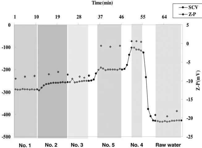 Fig. 4. Zeta-Potential and Streaming Current in Each Effluent from Five Sedimentation Basins and Raw Water (The Pressurised Water Flow Rate: 215 M3 Hr-1 (Fixed); Main Inlet Water Flow Rate: 5,280 M3 Hr-1 = 4.07% (Pumping Rate) (Park Et Al. (2009)).