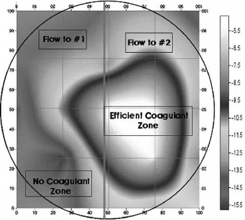 Fig. 9. Zeta-Potential Distribution Pattern in the Case Of Pumping Rate 8% (The Pressurised Water Flow Rate: 130 M3 Hr-1, The Main Inlet Water Flow Rate: 1,625 M3 Hr-1) (Park Et Al. (2009)).