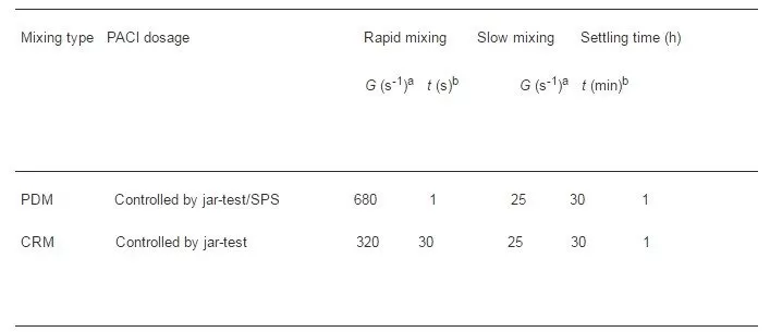 A scaled down mechanical mixing basin (length, width and effective height = 350 mm) is used for comparison with PDM for chemical coagulation (CC), with this mixing type defined as conventional rapid mixing (CRM) in Kim and Lee’s study (Kim and Lee (2006)). This mechanical mixing device employed the characteristic dimensions described in work conducted by Rossini et al. (1999). CRM consists of a square baffled container made of polymethylmethacrylate, with a six flat-bladed stainless steel turbine impeller of one-third the standard geometry, similar to that of a turbine impeller used in a real plant for drinking water production. The typical residence time (t) and velocity gradient value (G) (Shammas (2005)) for mechanical mixing are applied for adequate operation of CRM, with the PACl dosage decided using a jar-test. The operational conditions of PDM and CRM for the coagulation and sedimentation of pre-chlorinated water are shown in Table 2. PDM and CRM are also operated to investigate the effects of initial mixing type and coagulant dosage on NOM removal; thus, the PACl dosage is varied up to 30 ppm (7.1 mg L-1 as Al2O3) in a batch type process, and the supplementary addition of polyelectrolytes is not performed (Kim and Lee (2006)).