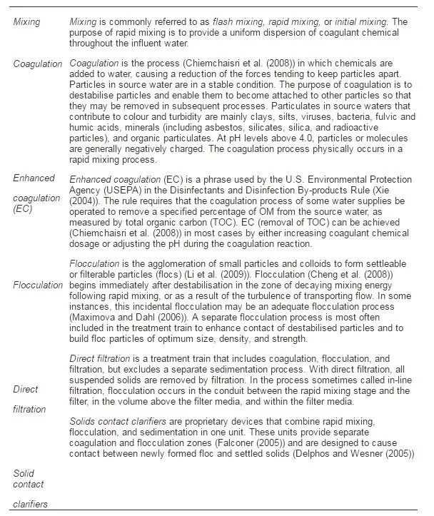 Table 4: Definitions of Mixing, Coagulation, and Flocculation (Li Et Al. (2009), Xie (2004), Delphos and Wesner (2005), Chiemchaisri Et Al. (2008), Cheng Et Al. (2008), Maximova and Dahl (2006), Falconer (2005)).