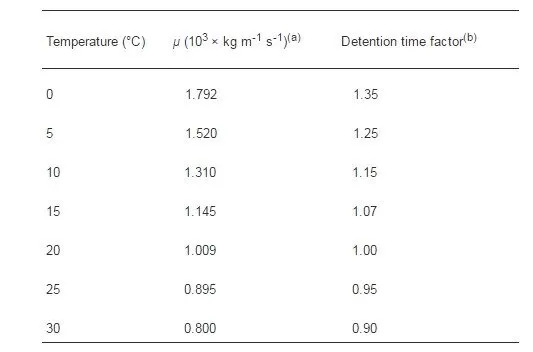 Equations are also available to calculate G for various types of mixing arrangements, and manufacturers of mixing and flocculation equipment provide information on G values for their equipment (Bridgeman et al. (2008)). Another parameter used in designing mixing systems is Gt, which is the dimensionless product of G and detention time t in s. Rapid mix and flocculation systems design (Thomas et al. (1999)) are temperature-dependent because water viscosity varies with temperature, as shown in Table 6(a). Guidelines for adjusting detention times in both rapid mix and flocculation basins are shown in Table 6(b) (Delphos and Wesner (2005), Atkinson et al. (2005), Yoon and Deng (2004), Prat and Ducoste (2007)).