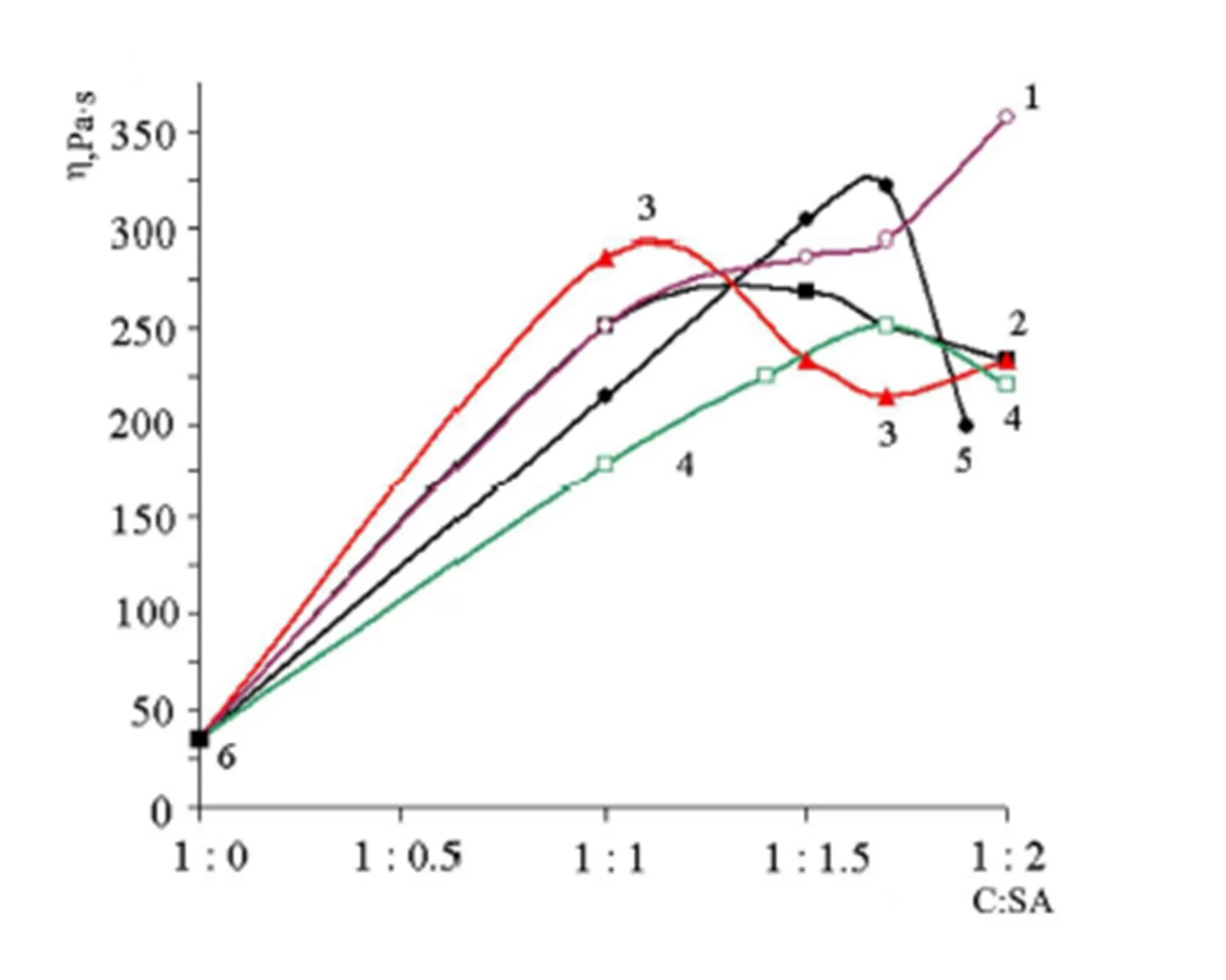 Figure1:Variation in effective dynamic viscosity (h) for the gels of the solvates of the complexes (C) as a function of SÐ and C : SÐ (concentration C = 2.0 wt.%) for the SÐ: HN(C8H17)2 (1); ROH mixture (2); O(C10H21)2 (3); C8H17OH (4); O(C8H17)2 (5) and [t-C4H9OB(OR)3]Li (6)
