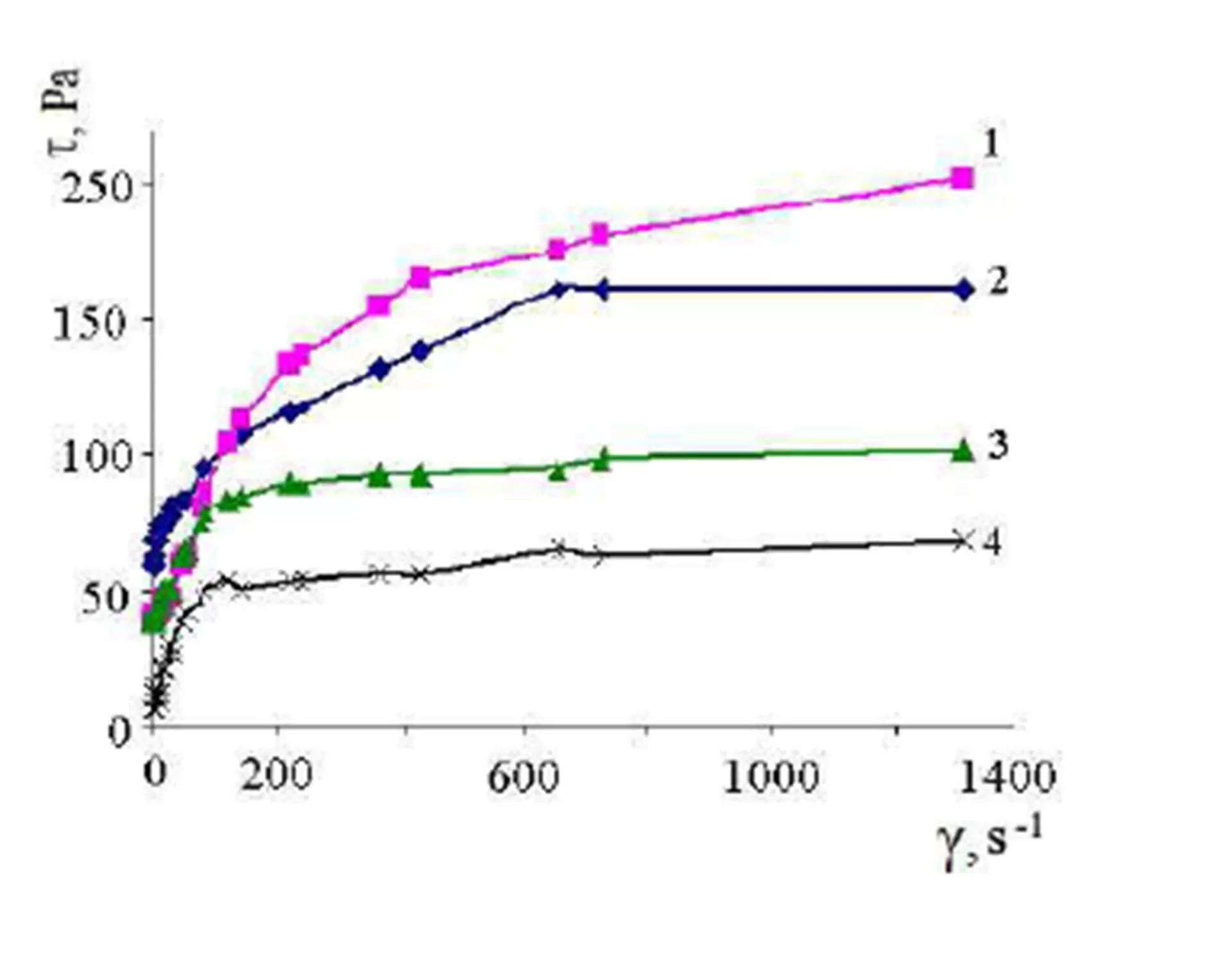 Figure 2: Curves of viscoelastic flow for the gels of the complexes and their solvates for C : SÐ =1 : 2; SÐ: ROH mixture (1); HN(C8H17)2 (2); O(C10H21)2 (3) and [t-C4H9OB(OR)3]Li (4)