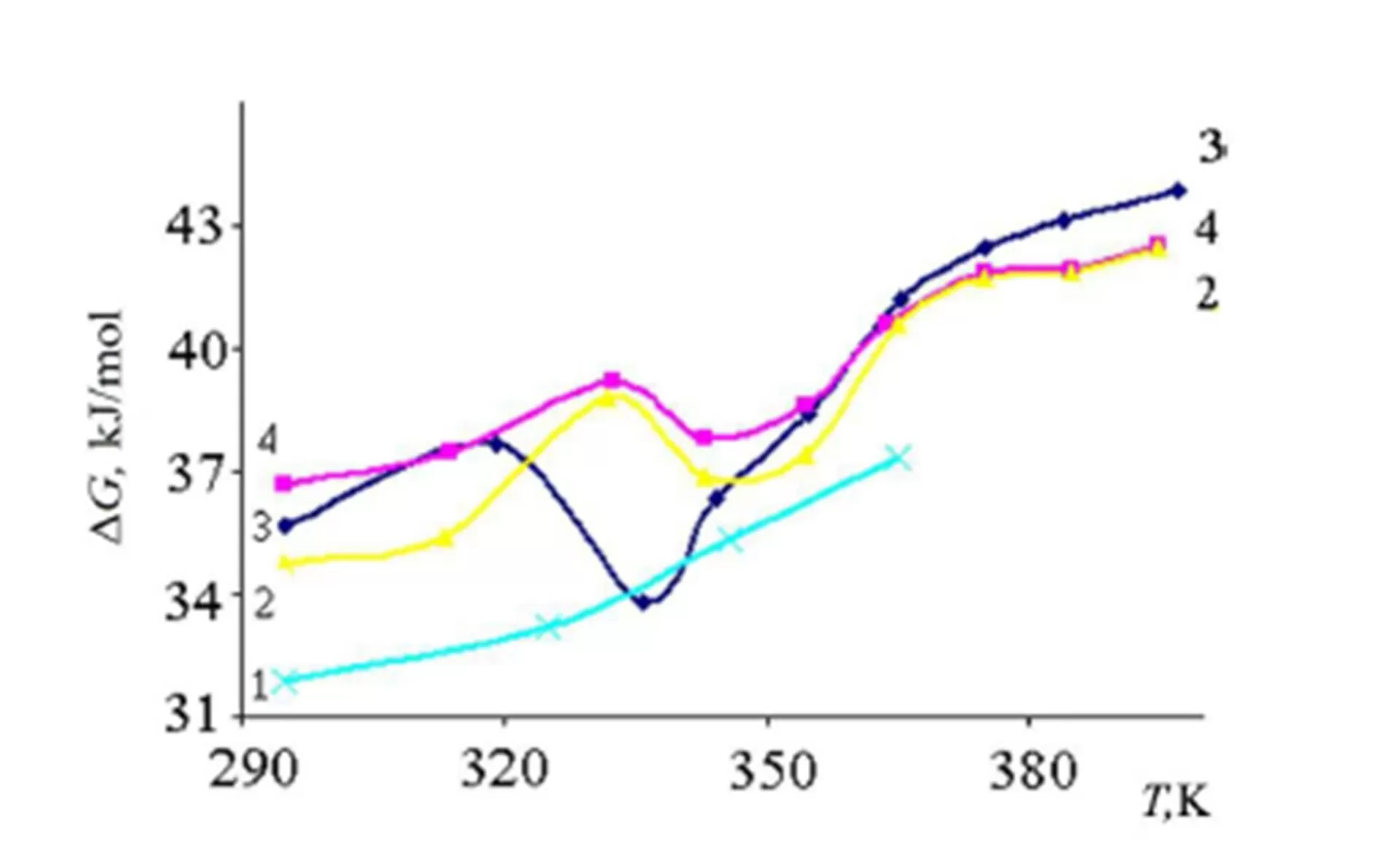 Figure 4: Variation in the activation energy of viscoelastic flow of the gels (DG) of the solvates of the complexes for C : SÐ = 1 : 2, C=2.0 wt. % as a function of temperature: [t-C4H9OB(OR)3]Li (1); SÐ: O(C8H17)2 (2); ROH mixture (3) and HN(C8H17)2 (4)
