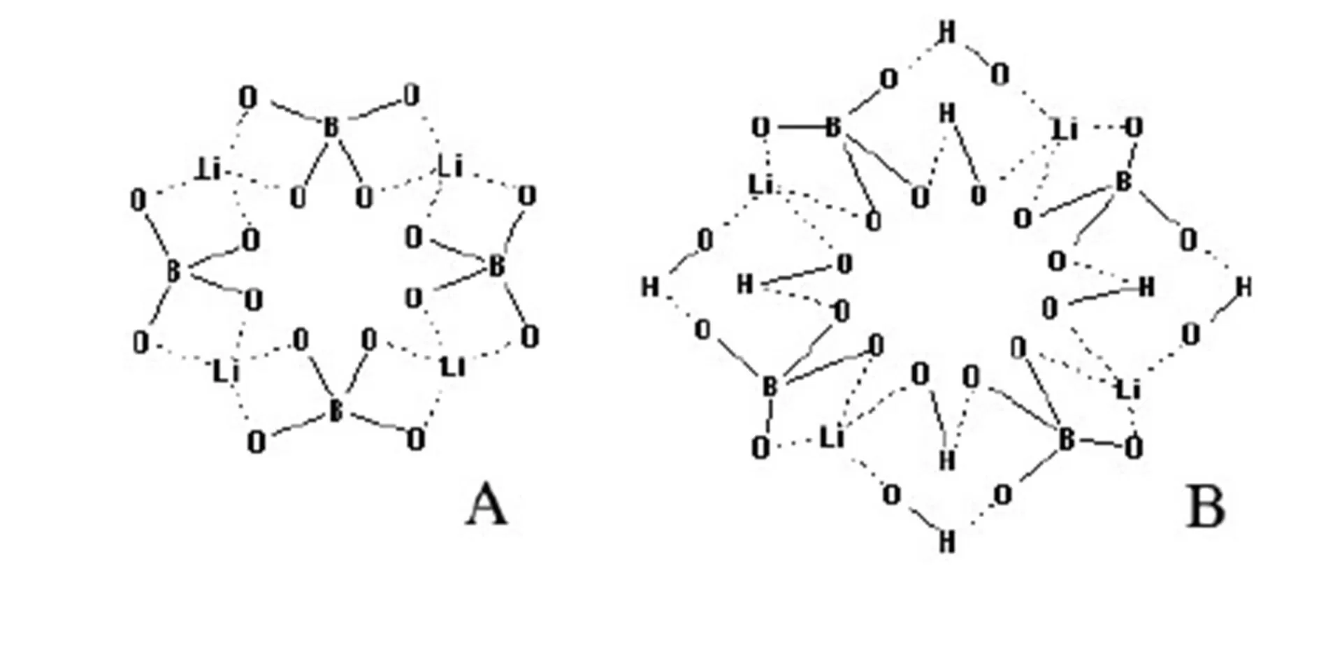 Figure 6: Macrocyclic structure of the Li…O bond associated complex (A) and its alcohol solvate (B)