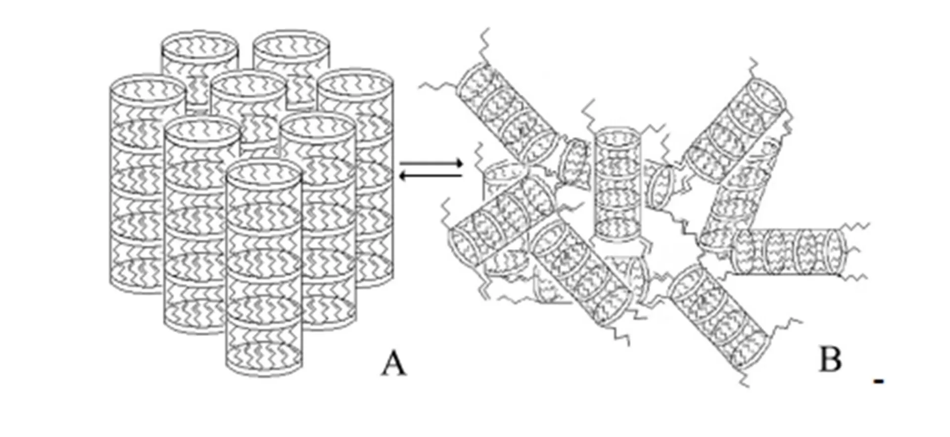 Due to the forces of dispersion interaction between the alkyl groups, super-molecules (tubes) are self-assembled to form a secondary supramolecular structure (Fig. 7). When a gel is exposed to shear stress, it is only its secondary supramolecular structure that is decomposed, while the associates (tubes) flow without changing their structure. Hence, the gels of complexes and solvates flow at a low activation energy ΔE (Fig. 4). An easy transition from a three-dimensional supramolecular structure (Fig. 7 B) into a cluster-like layered structure (A) induced by deformation and a reverse transition after the loading is removed corresponds to a high rate of relaxation of the supramolecular structure and to a constant viscosity at which the gels of solvates of the complexes flow (Fig. 2).