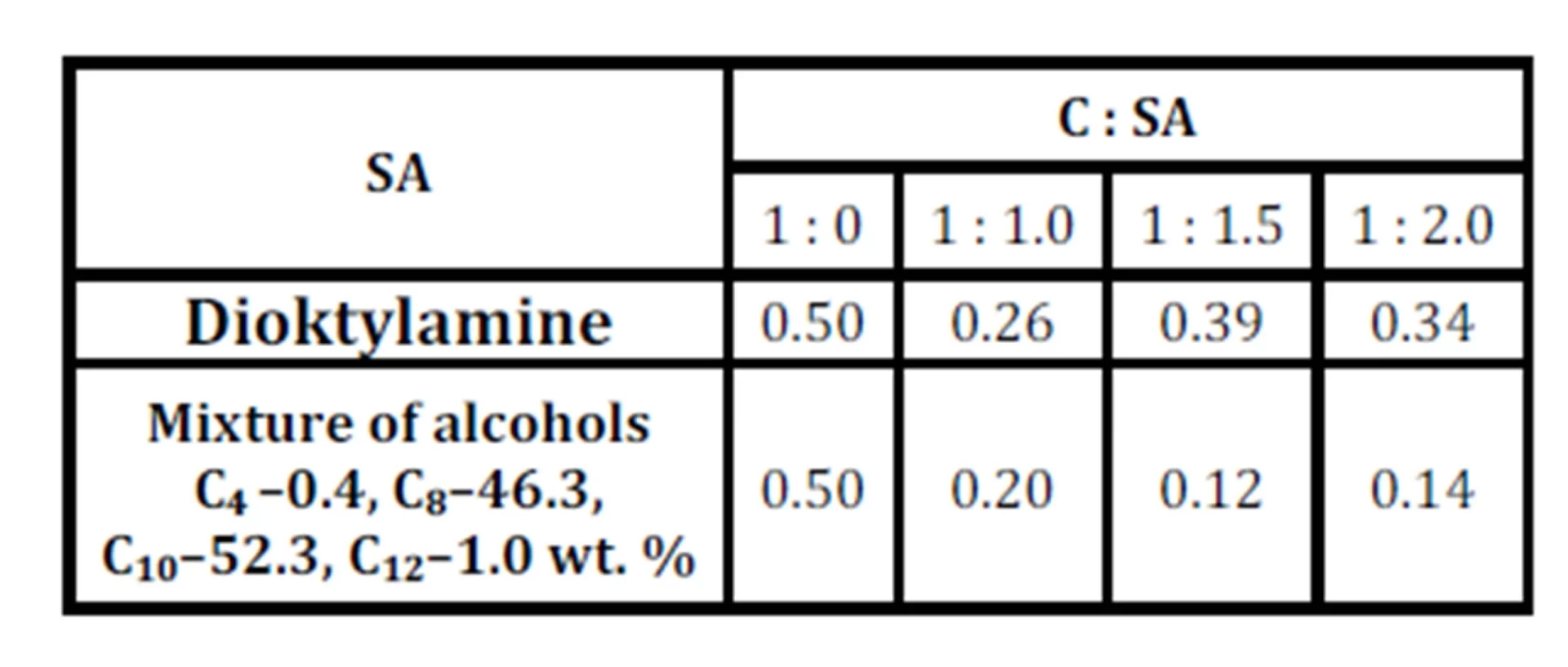 Table 3: Variation in the sedimentation rate (S, cm/min) of a single filler particle in a structured diesel fuel vs. the complex (C) concentration, mixture of alcohols (AM), and dioktylamine (DOA) in the solvates of the complexes for the C : SA ratio = 1 : 2