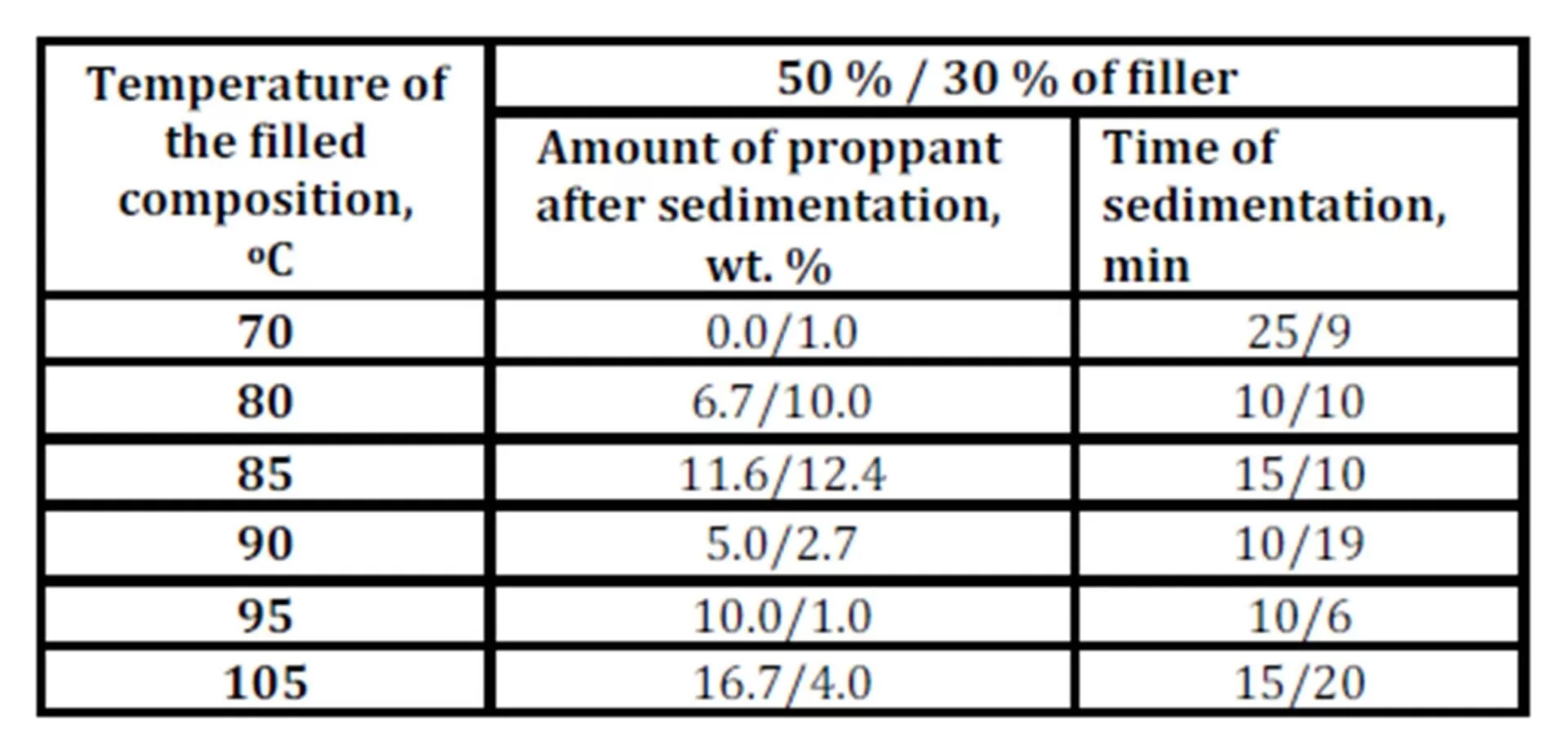 The sedimentation stability of the filled composition increases within the whole temperature range with the filler content in the gels of solvates of the complexes from 30 to 50 wt. % (Table 2). According to visual observations, the gel adhesion to glass decreases more significantly for a composition filled with 50 % of proppant as compared to that with 30 % of proppant. Under the influence of the proppant adsorption surface, the gel in the proppant-filled composition compresses due to this the sedimentation stability of the sand seems to increase. Based on the reduced gel adhesion in the proppant-filled composition, an assumption could be made that this would reduce the energy required to pump the composition into the channel (fracture) of a subterranean reservoir.