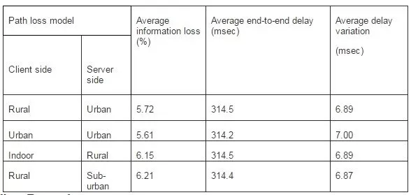 With 12 voice calls within the cell, Figure 6 indicates the percentage of information loss for different path loss models. In an indoor environment, the calls experience less information loss than those in other environments. In a rural environment, voice calls encounter an average loss of 3.2%. Calls in the sub-urban environments experience almost similar losses. Free space and Hata-large-city models exhibit the highest levels of information loss. Average end-to-end delay values also show similar behaviors. The indoor environment experiences the lowest average end-to-end delay in comparison to calls in other environments. End-to-end delay values in all environments, except for pedestrians, are within the target performance ranges recommended by 3GPP and ITU-T.