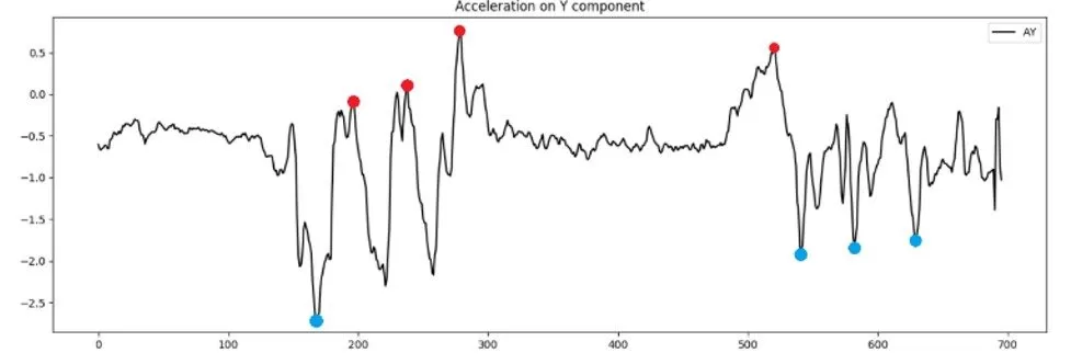 when moving in the forward direction, with the mobile phone in portrait mode, with the screen parallel to the floor, on Y component of the acceleration, before the first step there is a slight decrease in the acceleration value on this segment, followed by steep increases associated with each step, these increases exceeding in value the adjacent trend;