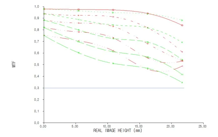 The resolution of the proposed optical system was evaluated through simulations conducted in the Code V software. The outcomes are presented in Figure 2, which illustrates the modulation transfer function (MTF) as a function of image height for different field positions relative to the optical axis. Separate MTF curves were generated for sagittal and tangential (radial) orientations, with the averaged values used to determine the effective resolution expressed in line pairs per millimeter (LP/mm). The results demonstrate that the design achieves a resolution exceeding 50 LP/mm across the full image field.