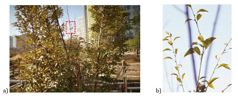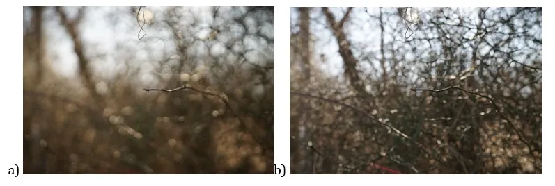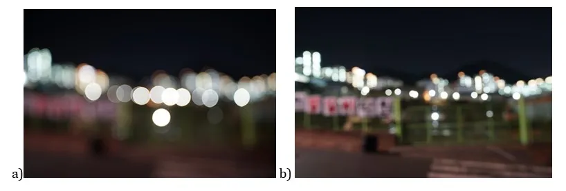 Fig.6. Outdoor blur tests of a 21mm photographic lens, a) photo taken by a lens with the aperture set to f1.5, b)